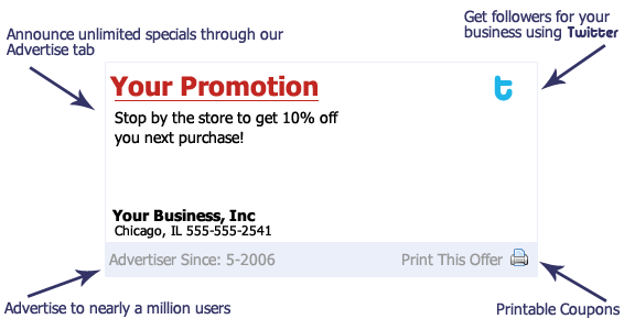 Reach Out to New Prospects Online We provide you with text-based ads that you control and we display to our huge community of over 1,000,000 members. Change your ad or coupon as often as you like at no cost.